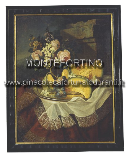Il dipinto (citato nell'inventario di Luigi Prosperi del 1863 come "Id. con Fiori, Piatto con Fette di Meloni, e panneggio") è siglato P.M. sull'angolo della tovaglia orlata di pizzo: le lettere sono realizzate con un minuscolo puntinato in bianco su bianco. La composizione è collocata all'aperto, colpita da una luce radente che illumina in parte anche il pilastro che chiude lo sfondo, sulla destra. Un drappo rosso frangiato d'oro e la tovaglietta bordata di merletto a fuselli ricoprono interamente il piano sul quale un lucido piatto di metallo accoglie una zucca tagliata in tre parti, dell'uva e un fico. Sullo spicchio di zucca, al centro, è posata una mosca. Gocce di rugiada e alcuni semi di zucca ......